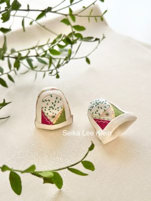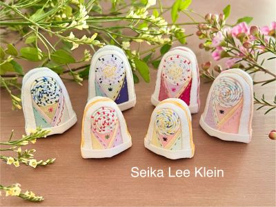 These are traditional thimbles from the Gyeongsan-do region in Korea. A lot of skill and wisdom are packed in such a small traditional handicraft. I mixed various kinds of threads and stitches to create a fun and warm atmosphere. Gyeongsan-do is where my grandparents were from, so I have special feelings in my heart.
